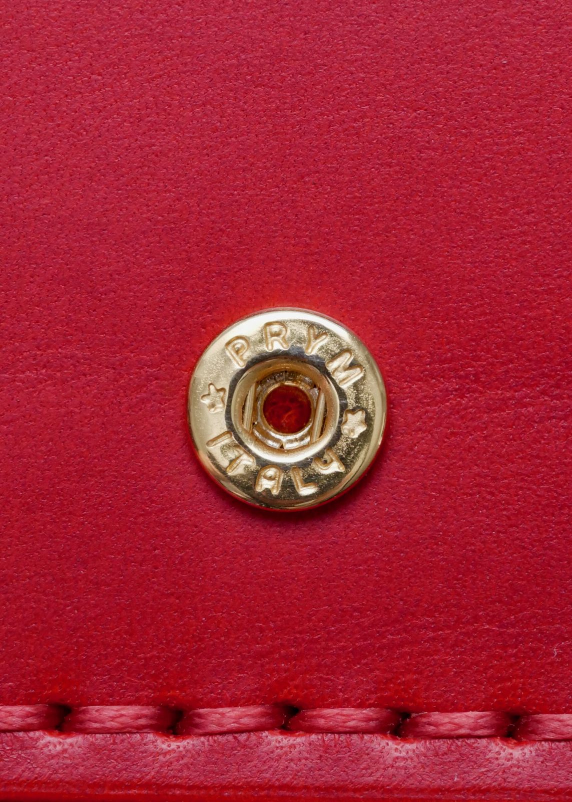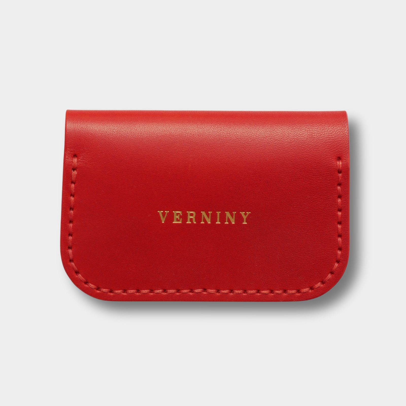 Dámske puzdro na karty Red 003 s pevným zapínaním Prym a červeným šitím. Vyrobené ručne na Slovensku z pravej kože Buttero, so zlatým logom Verniny vyrazeným pomocou fólie Foilco.